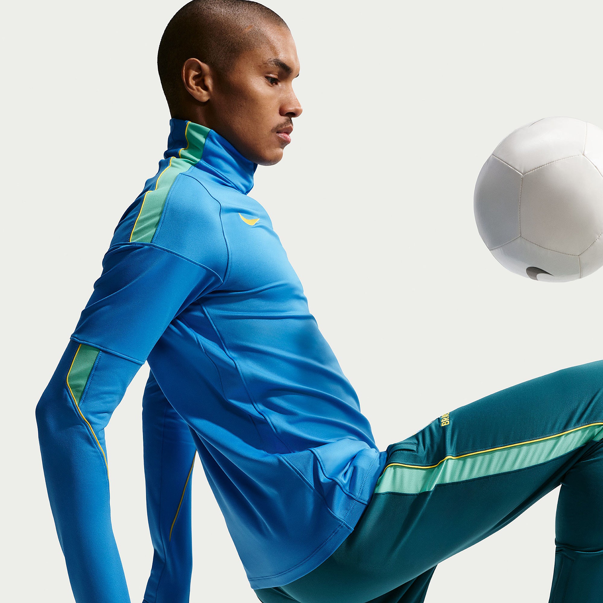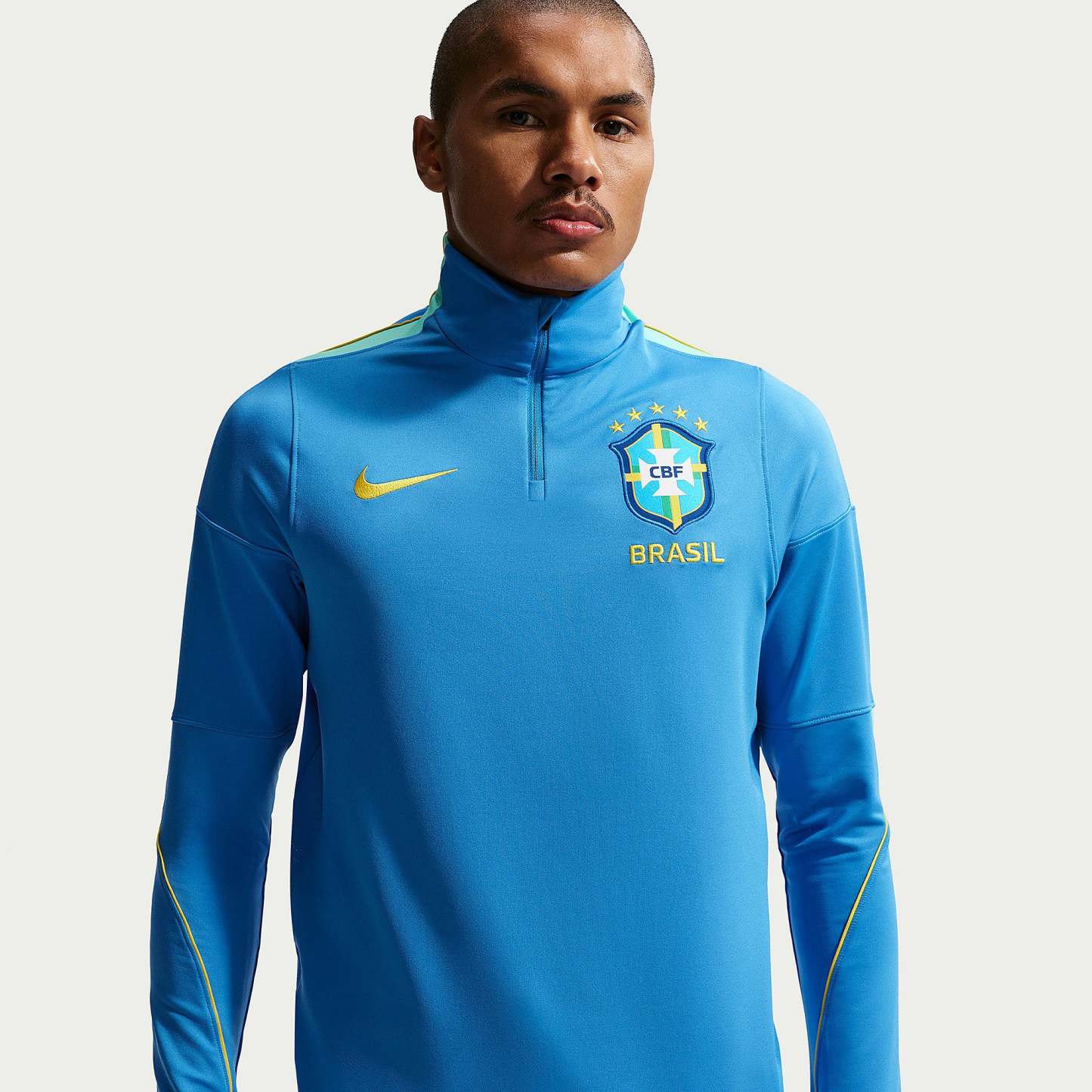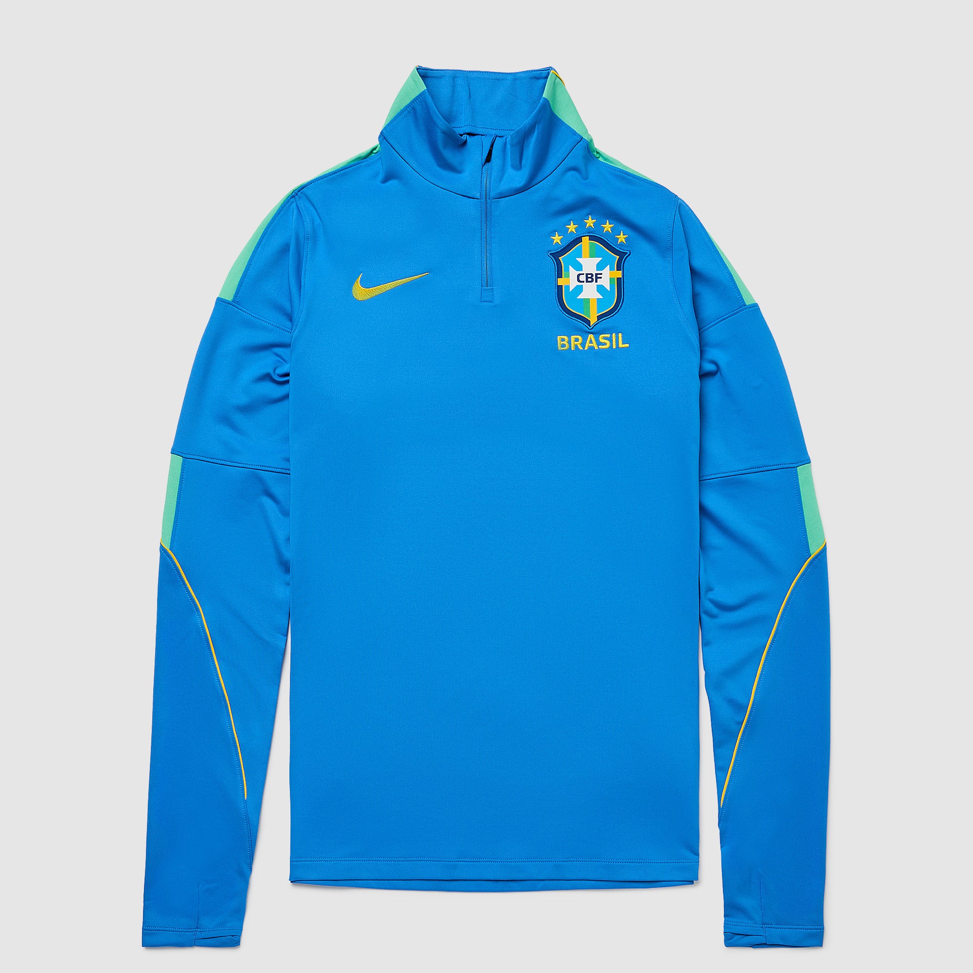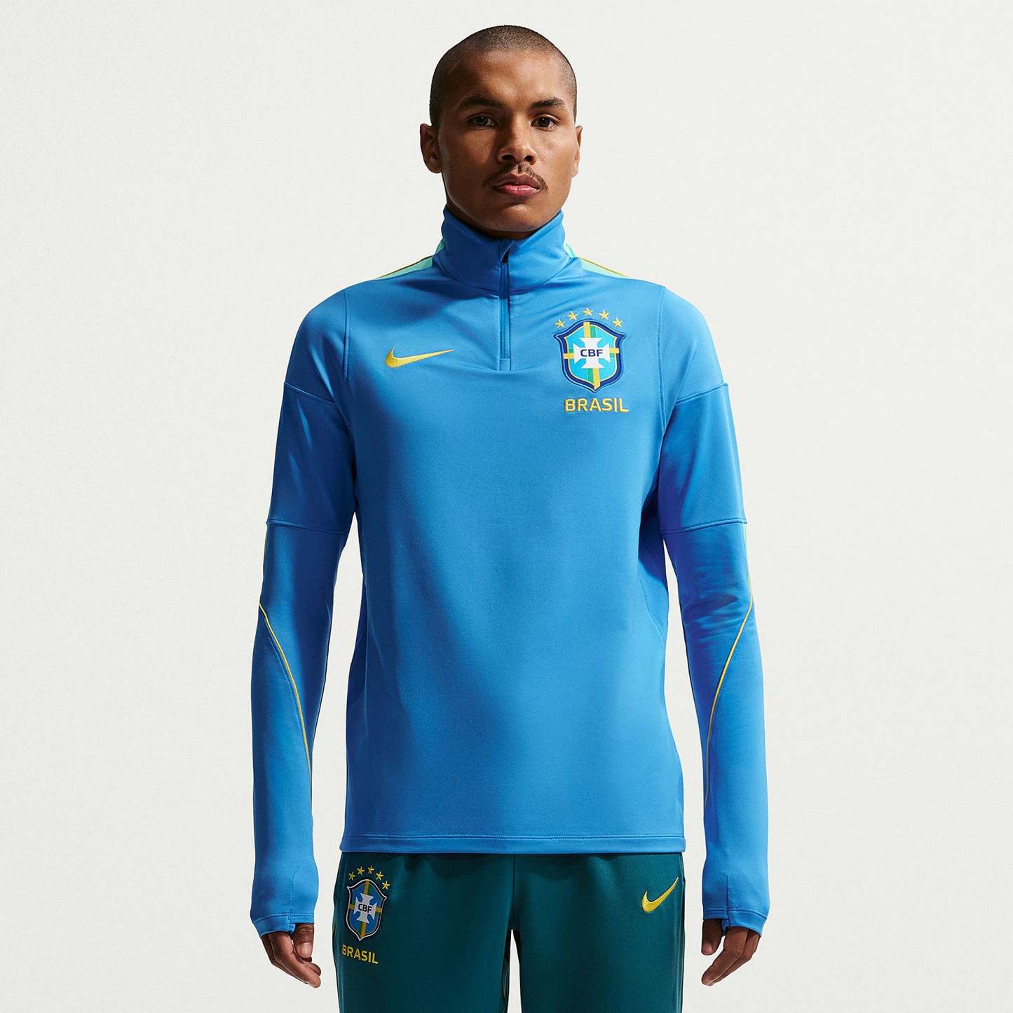 Part of the official Brazil 2026 World Cup training range, the Strike Drill Top is worn by the likes of Vinicius Junior, Rodrygo, Marquinhos, Casemiro and Estevao as they hone their skills, prepare to take on Morocco, Scotland and Haiti in Group C, and set their sights on the FIFA World Cup trophy. Vibrant LT Photo Blue, Light Menta and Midwest Gold colours create a patriotic, flag-inspired look, and the legendary Confederacao Brasileira de Futebol (CBF) crest emblazoned over the heart displays your passion for the world to see.The ultra-lightweight, flexible construction provides full freedom of movement, so you can sprint across the turf, slide into tackles and leap into aerial challenges without restriction. Breathable, sweat-wicking Dri-FIT performance fabric promotes airflow, absorbs moisture and dries quickly to keep you cool, dry and comfortable as you push past your limits, whether you're straining to hit a new personal best in the gym, honing your technique in training, fighting to win every duel on the pitch or wildly celebrating a crucial win at the 2026 World Cup.