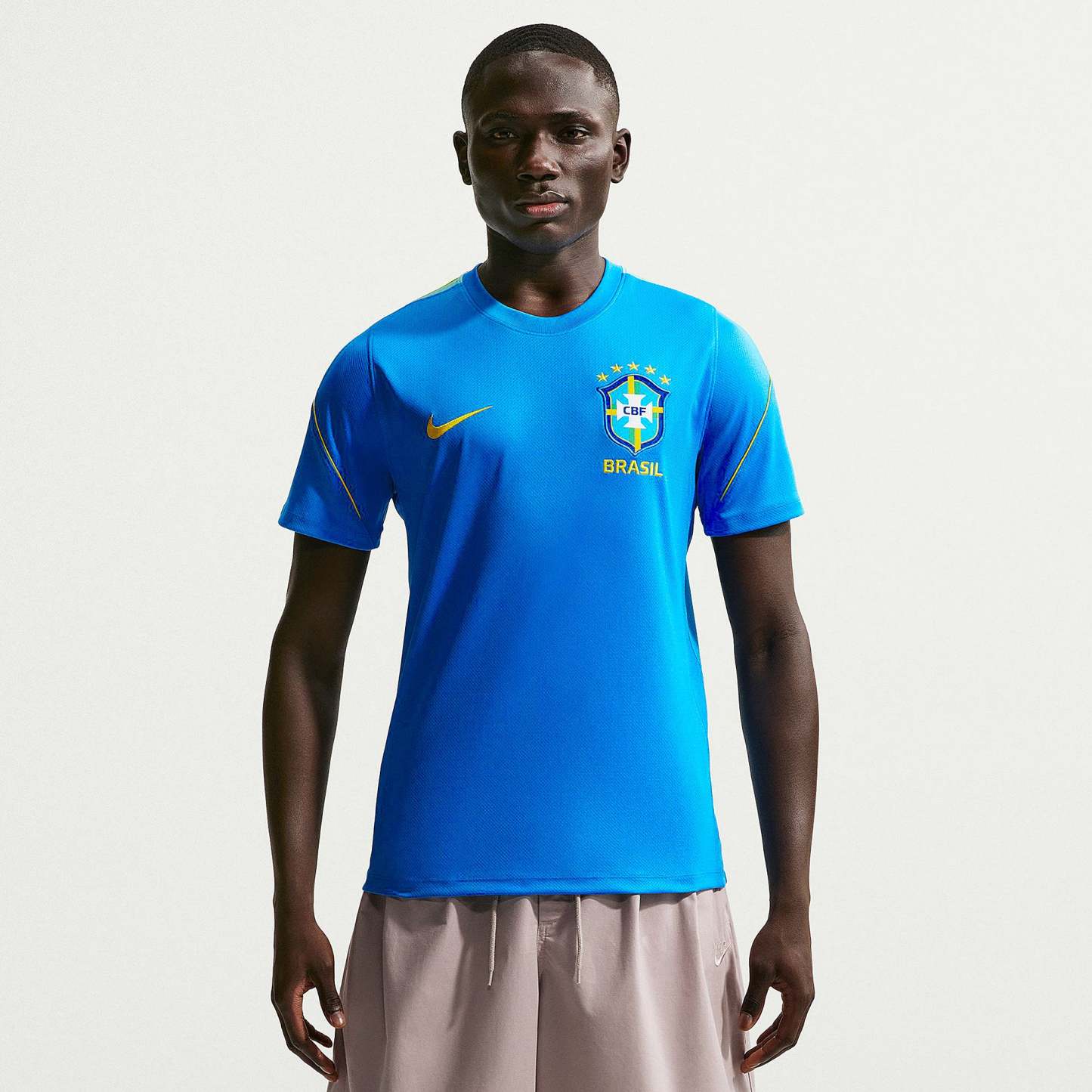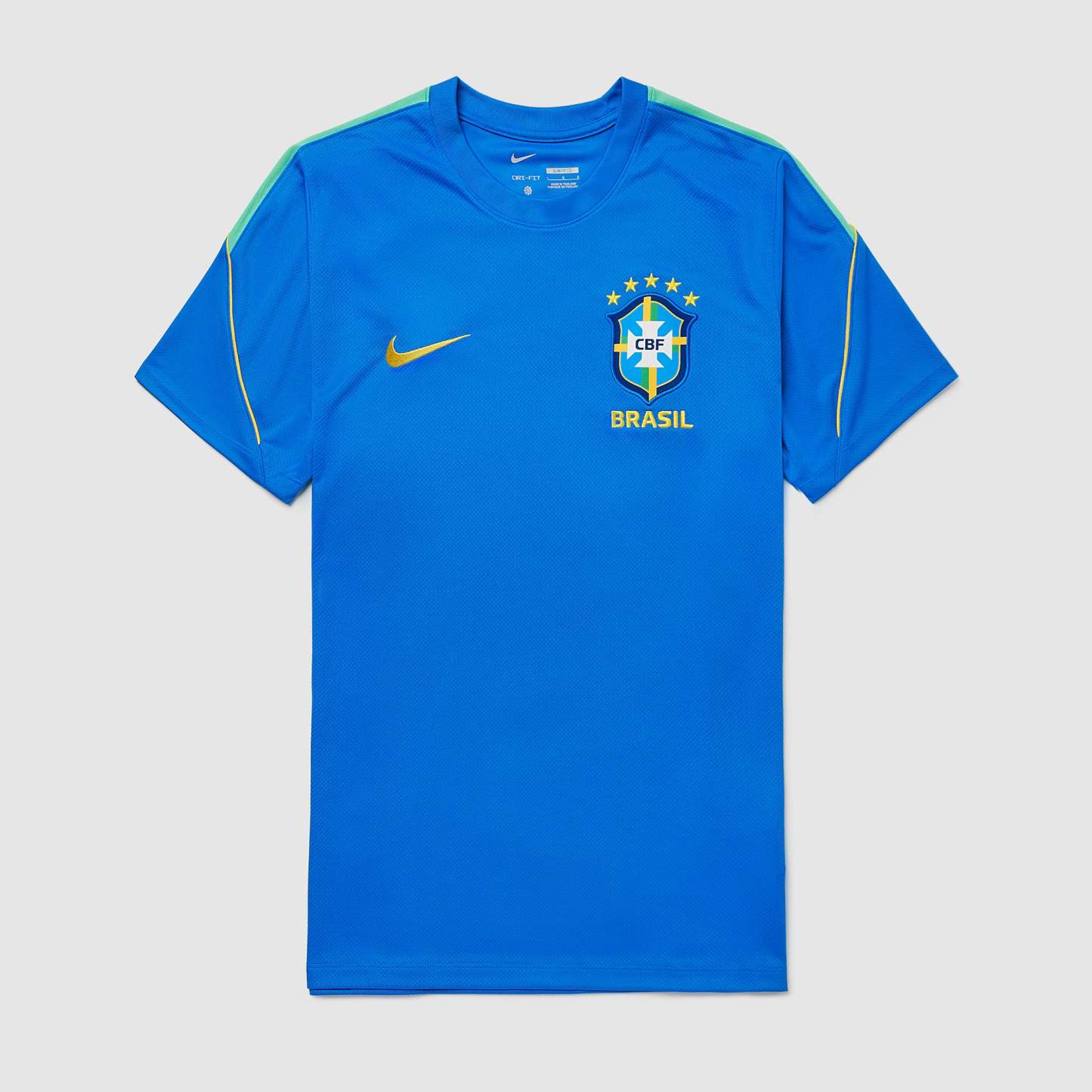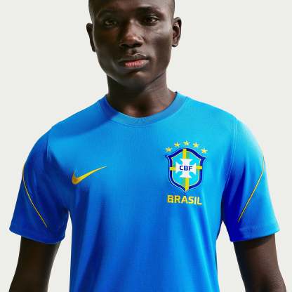 Part of the official Brazil 2026 World Cup training range, the Strike Shirt is worn by the likes of Vinicius Junior, Rodrygo, Marquinhos, Casemiro and Estevao as they hone their skills, prepare to take on Morocco, Scotland and Haiti in Group C, and set their sights on the FIFA World Cup trophy. Vibrant LT Photo Blue, Light Menta and Midwest Gold colours create a patriotic, flag-inspired look, and the legendary Confederacao Brasileira de Futebol (CBF) crest emblazoned over the heart displays your passion for the world to see.The ultra-lightweight, flexible construction provides full freedom of movement, so you can sprint across the turf, slide into tackles and leap into aerial challenges without restriction. Breathable, sweat-wicking Dri-FIT performance fabric promotes airflow, absorbs moisture and dries quickly to keep you cool, dry and comfortable as you push past your limits, whether you're straining to hit a new personal best in the gym, honing your technique in training, fighting to win every duel on the pitch or wildly celebrating a crucial win at the 2026 World Cup.