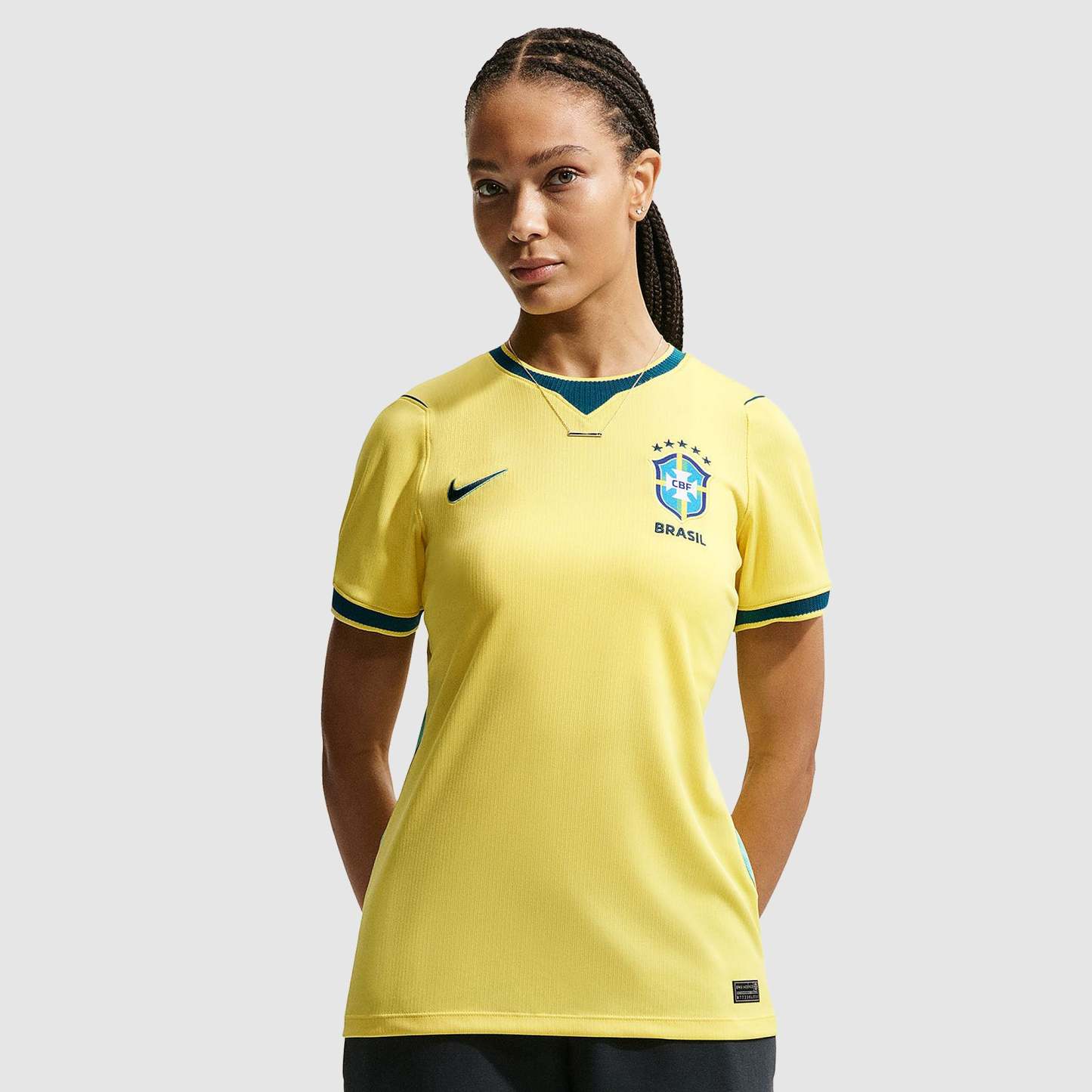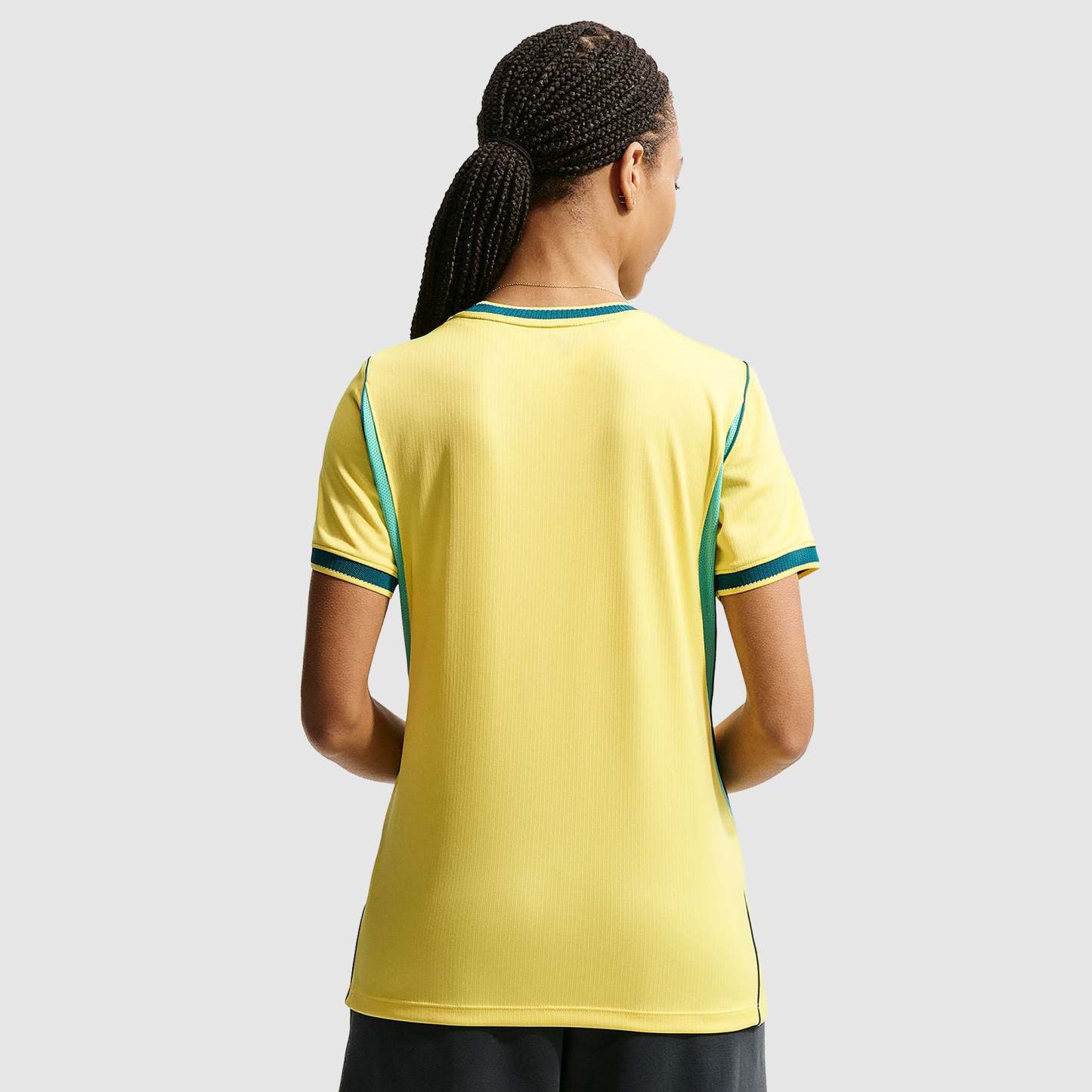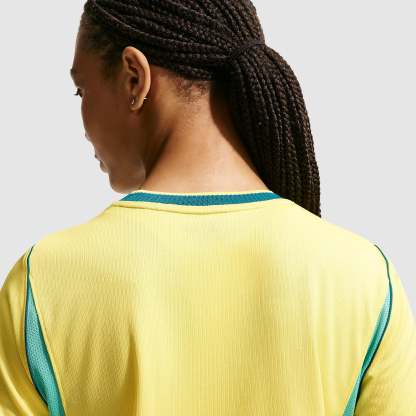 Stand with the Selecao as they look to claim a record-extending sixth FIFA World Cup with the Nike Brazil 2026 Women’s Dri-FIT Stadium Home Shirt in Canary/Light Menta/Geode Teal, a comfortable home jersey packed with patriotism.