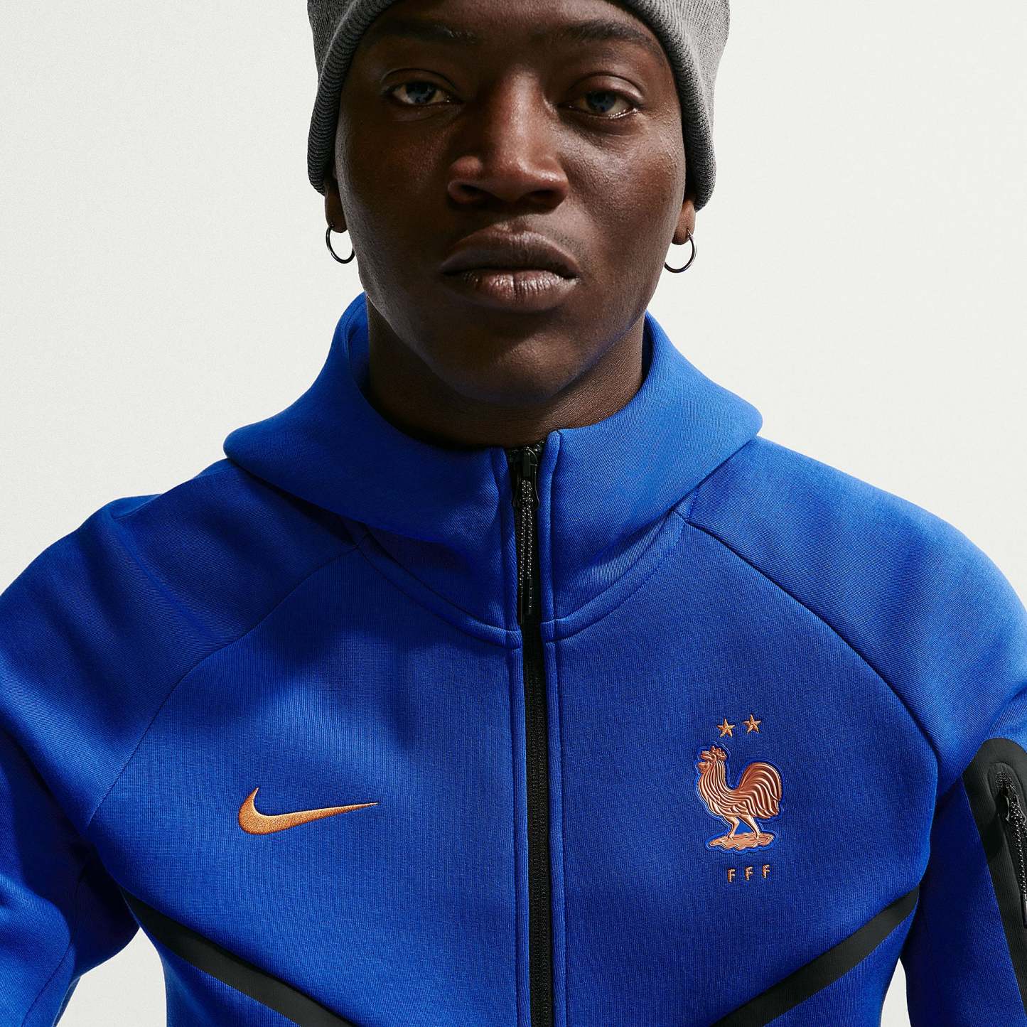Stand with Les Bleus as they look to win a third FIFA World Cup with the Nike France 2026 Tech Fleece Windrunner Hoodie in Game Royal/Metallic Copper, a warm overlayer packed with patriotism.