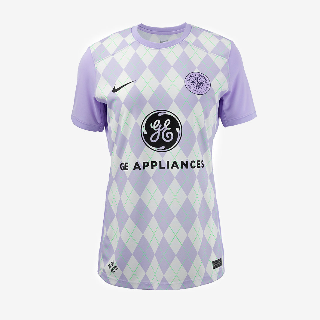 Based on the kits worn by Jaelin Howell, Abby Erceg, Carson Pickett, Taylor Kornieck Flint and the rest of the first-team squad at the pinnacle of US soccer, the 2024 home jersey shows your undying support for Racing as they compete for NWSL glory. Inspired by Louisville’s deep connection to horse racing, a sleek lavender, white and mint diamond and argyle design evokes traditional racing silks, and the Racing crest emblazoned over your heart displays your passion for the world to see. The ultra-lightweight, flexible weave provides full freedom of movement and keeps you quick on your feet, so you can dribble past defenders, make last-ditch game-winning tackles and relentlessly pound up and down the touchline for 90 minutes with ease. High-performance Dri-FIT fabric is breathable and moisture-wicking, so you stay cool, dry and comfortable in any situation, whether you’re pushing past your limits in a competitive game or cheering your club on from the stands. An updated standard fit is specifically tailored for women to help you take your performance to another level.