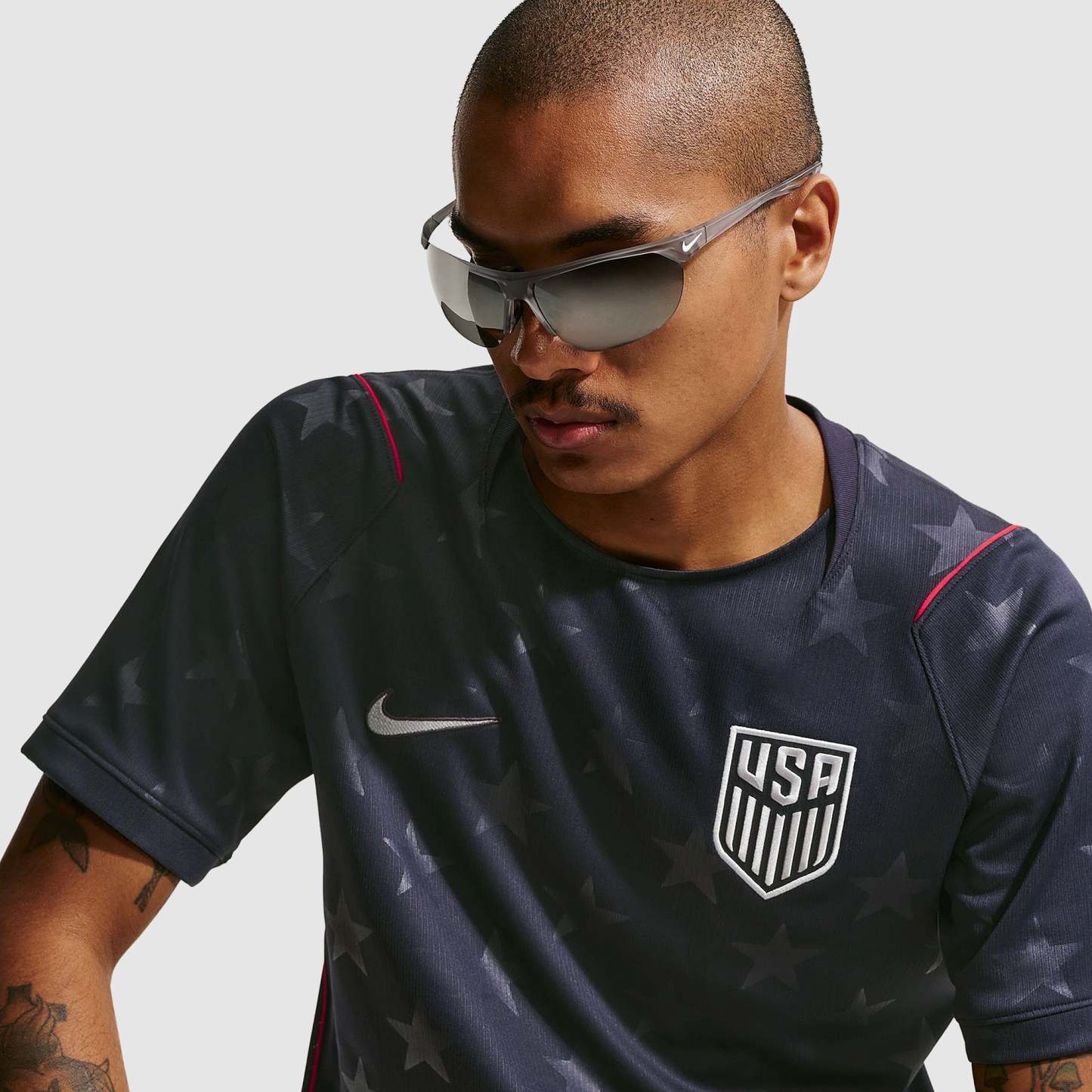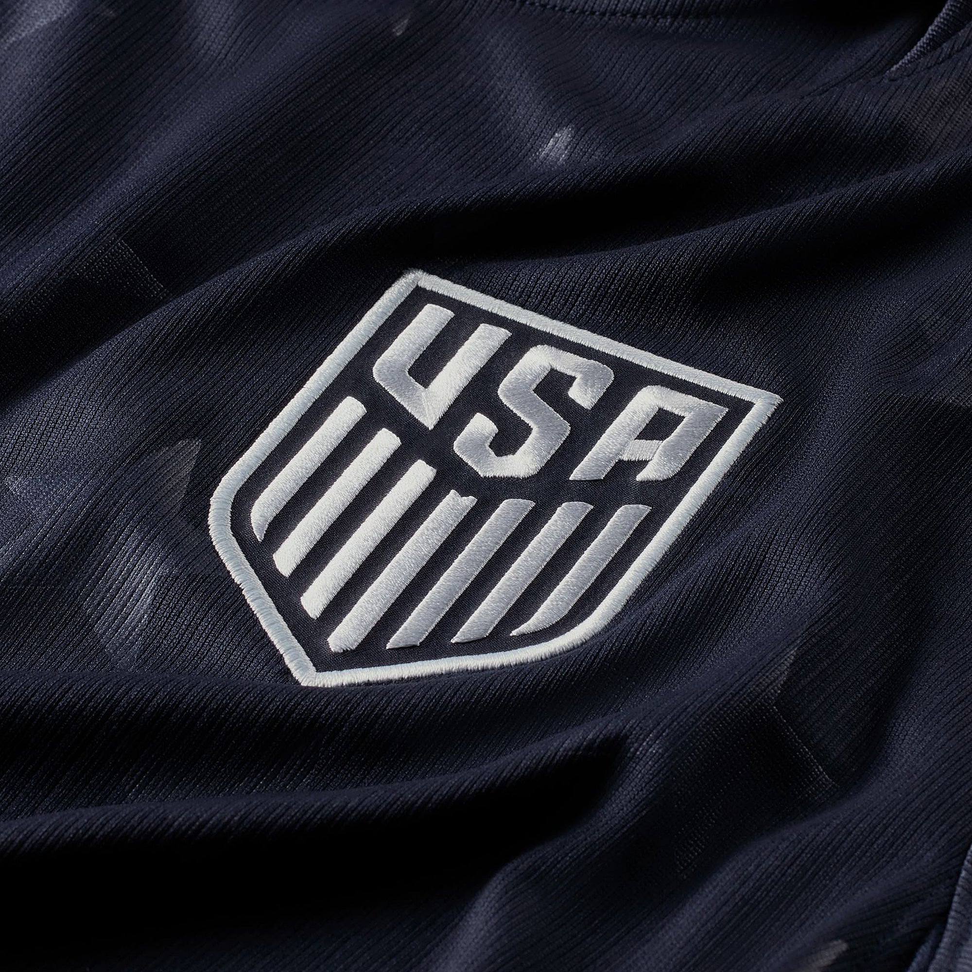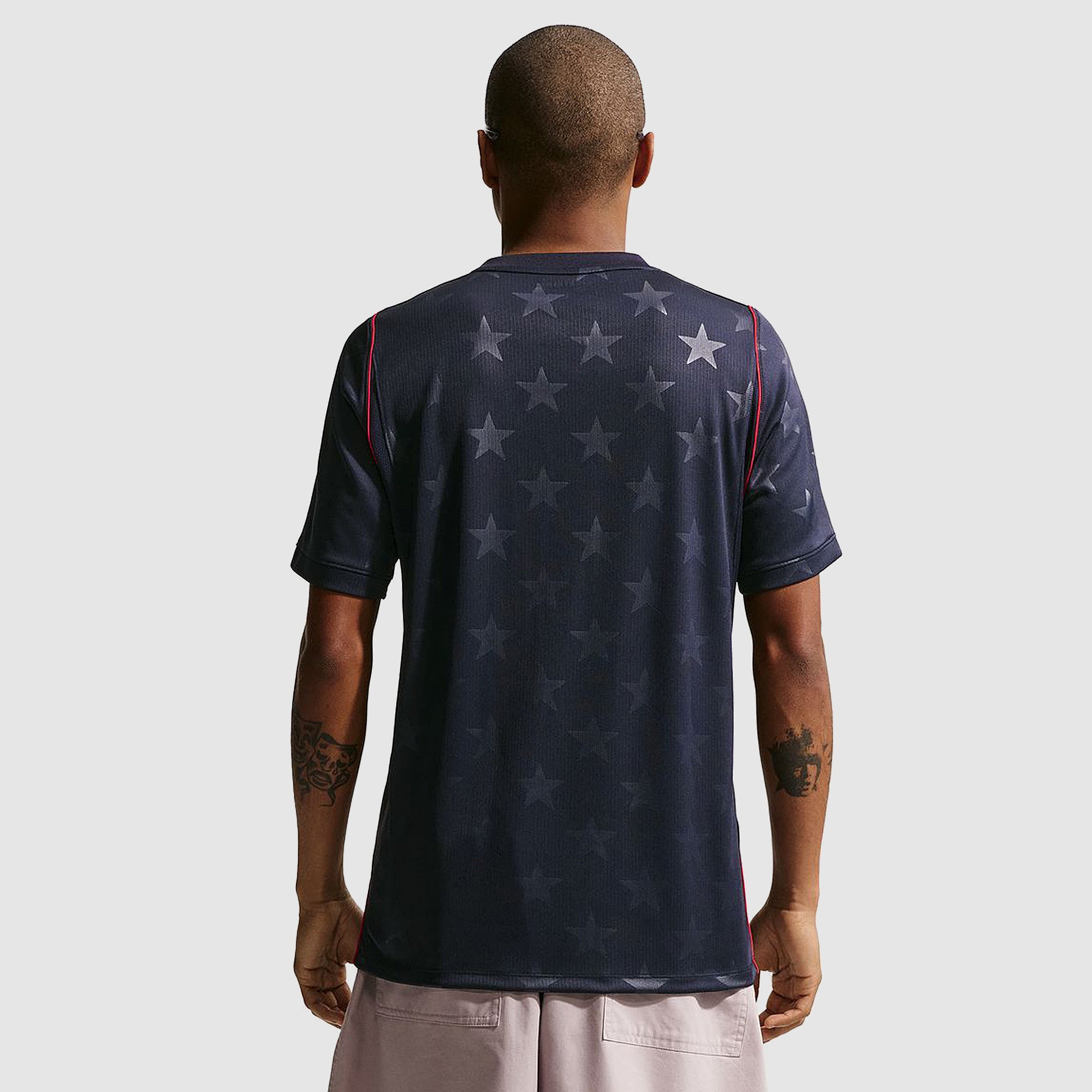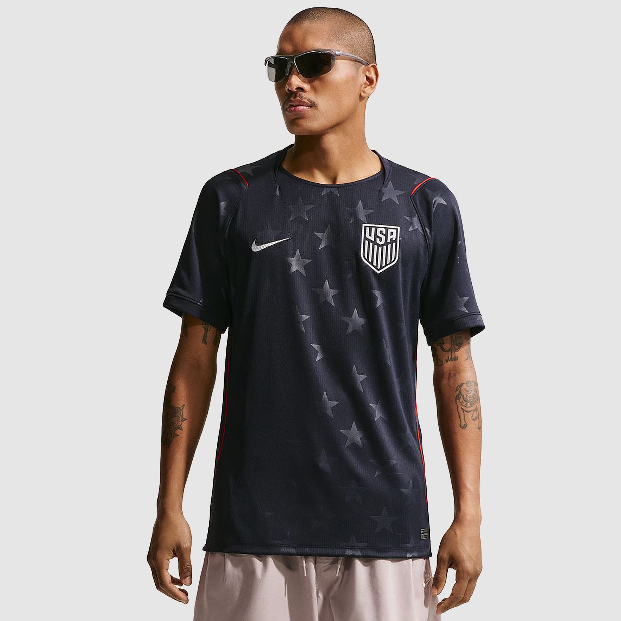 Based on the kits worn by Tyler Adams, Folarin Balogun, Sergino Dest, Brenden Aaronson, Chris Richards and the rest of a star-cleatded squad at the pinnacle of international soccer, the 2026 away jersey shows your support for The Stars and Stripes as they welcome the world, take on the likes of Australia and Paraguay in Group D, and look to progress to the latter stages of the World Cup knockout phase. Inspired by the USA flag, a smart Dark Obsidian base is overlaid with a subtle tonal star graphic and vibrant red contrast piping to create an eye-catching, patriotic look, and the United States Soccer Federation (USSF) crest emblazoned over the left chest shows which nation your heart belongs to for the world to see.