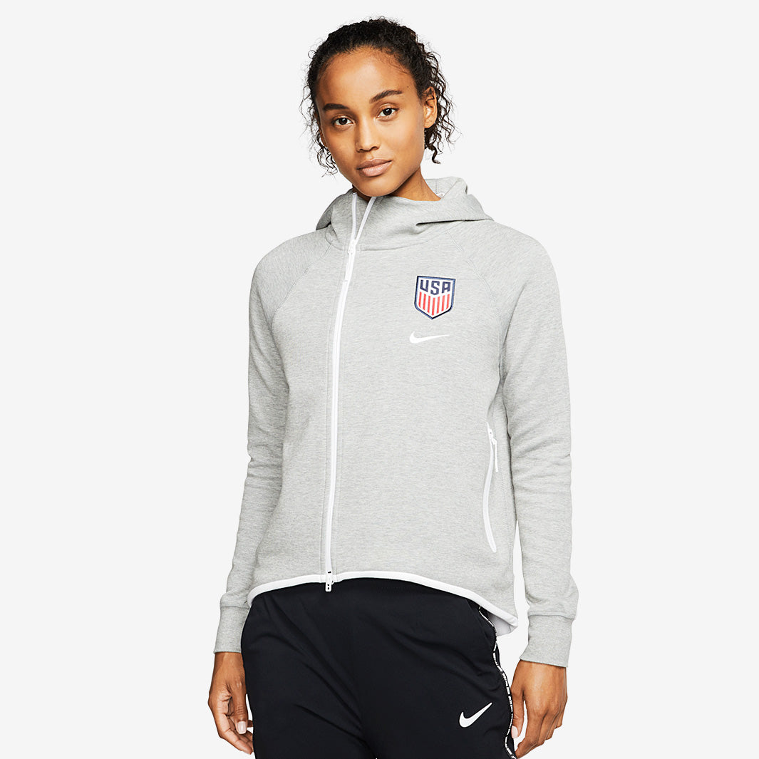 The Nike Womens USA 2019 Tech Fleece in Dark Grey Heather, Matte Silver and white are ideal as a wardrobe staple, with warm Nike Tech Fleece fabrics to help keep you cozy and sleek three-panel hood. A standard fit provides a relaxed feel, while reinforced pockets give extra coverage or storage as needed.